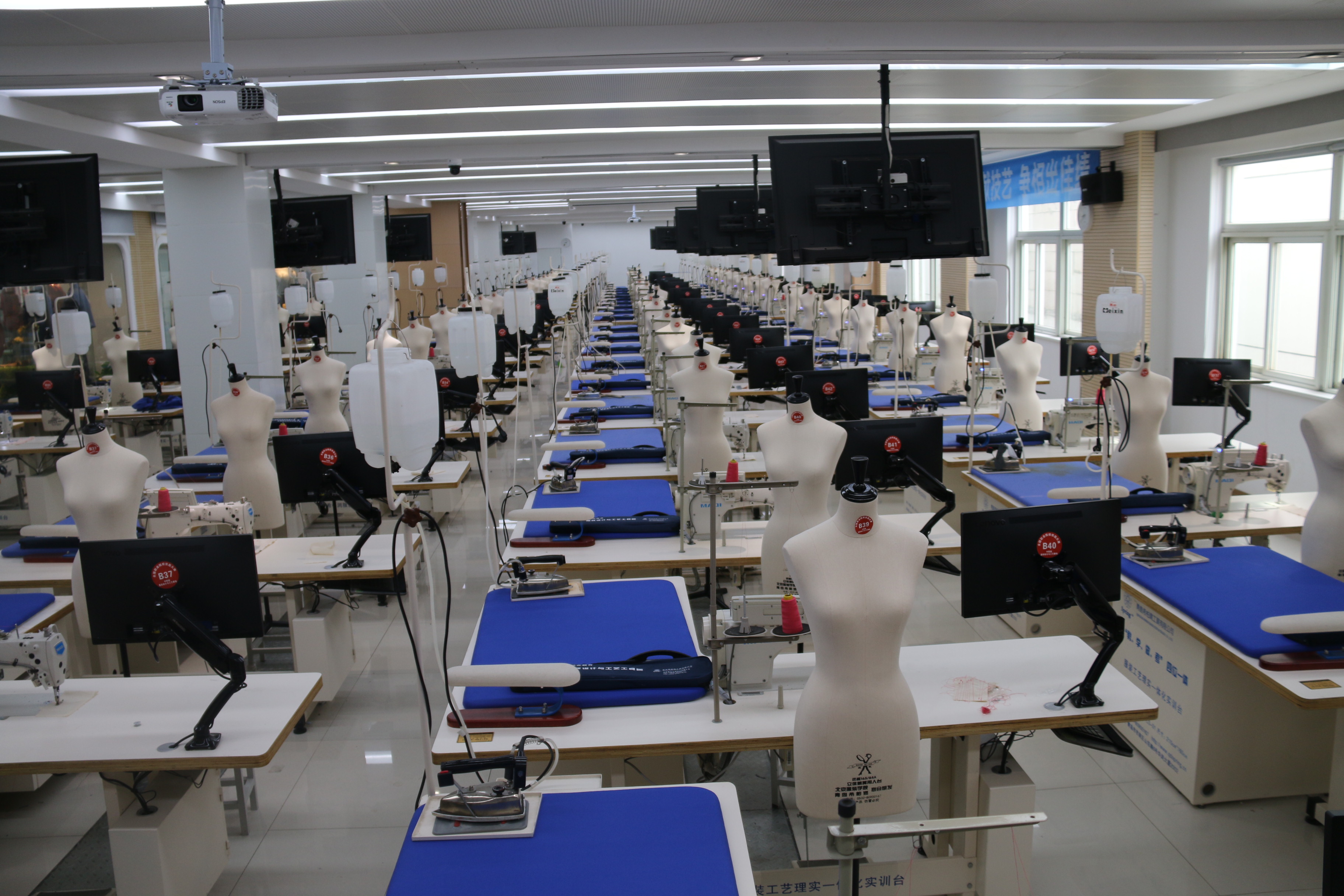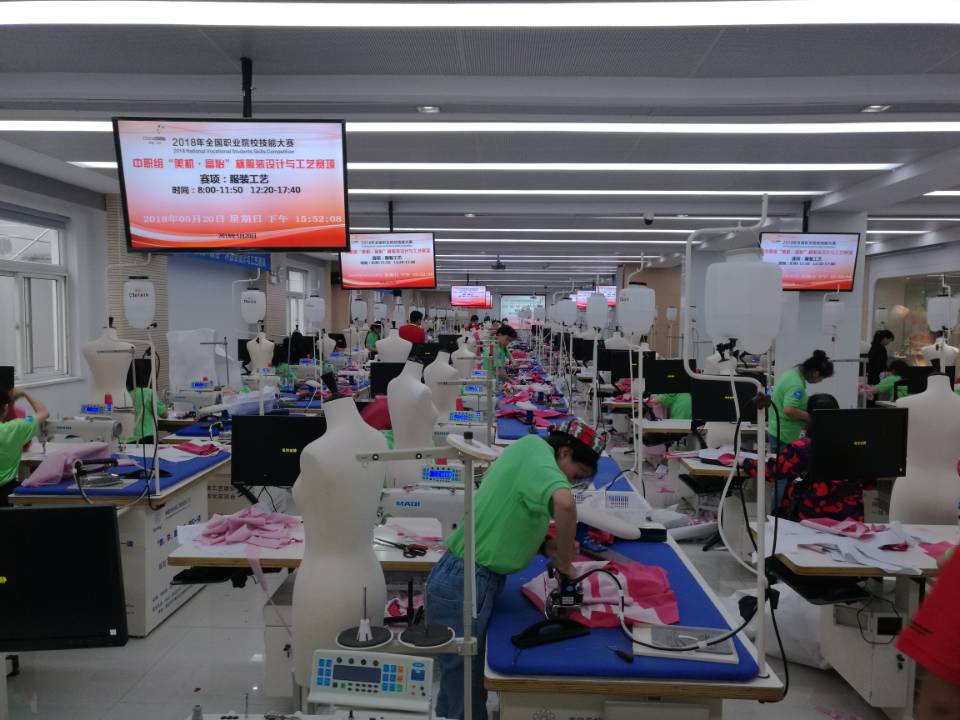 工艺赛项中,选手们用我公司提供的服装工艺理实一体化实训台制作作品。