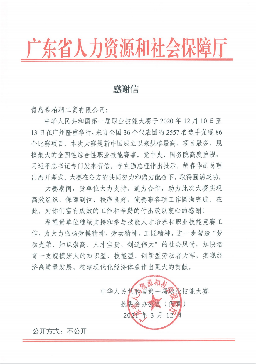 感谢广东省人力资源和社会保障厅、中华人民共和国第一届职业技能大赛执委会办公室对我公司工作的认可和鼓励,我们将一如既往的支持和和参与技能人才培养和职业技能竞赛工作,为大力弘扬劳模精神、劳动精神、工匠精神,进一步营造“劳动光荣、知识崇高、人才宝贵、创造伟大”的社会风尚,加快培育一支规模宏大的知识型、技能型、创新型劳动者大军,实现经济高质量发展、构建现代化经济体系作出更大的贡献。